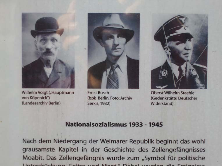 Des gens en partie très connus étaient détenus dans la prison, comme le fameux 'héro populaire' "Le sergeant de Köpenick" (un petit criminel qui ridiculisait la discipline prusienne en volant le trèsor d'une mairie en guise d'un chef de police qui commandait un groupe de policiers qui suivaient ses commandes sans questionner son autorité...), le chanteur communiste Ernst Busch (interprète fameux de Bertold Brecht) et - comme exemple de tant d'autres - le Colonel Staehle qui se battait contre les Nazis...