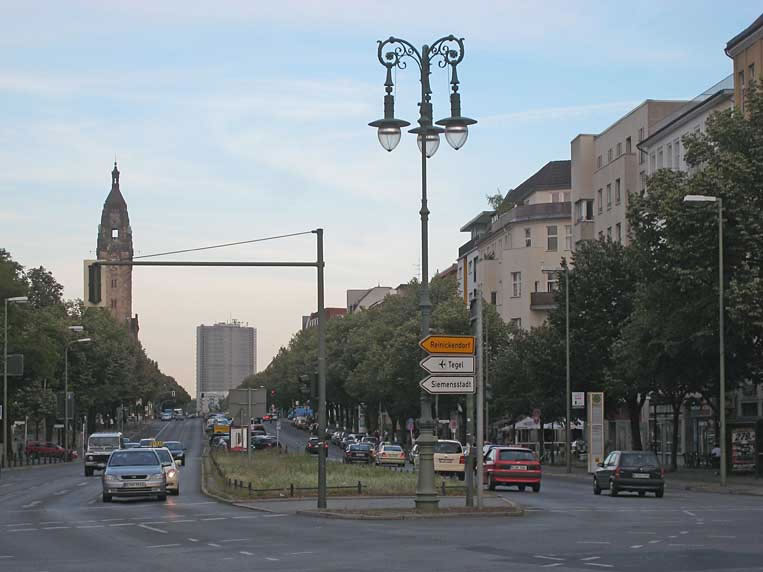 Blick durch die Otto-Suhr-Alle Richtung Ernst-Reuter-Platz (dort TU-Hochhaus) mit Rathaus Charlottenburg